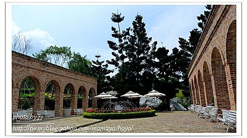 連續的半圓形拱柱,中有花草圍住噴水池,非常漂亮,