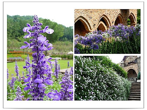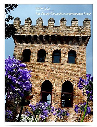 藍紫色的花襯托著雄偉的城堡,別有趣味。